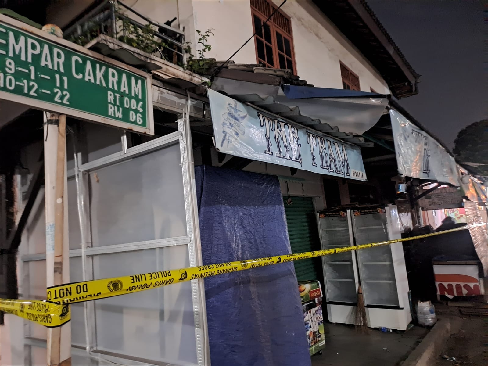 Letak warung Sembako dan es kelapa nampak bersebelahan. Keberadaannya persis di sisi gang akses masuk pemukiman. Warga sekitar menyebut, sejumlah personil kepolisian mendatangi lokasi siang tadi.