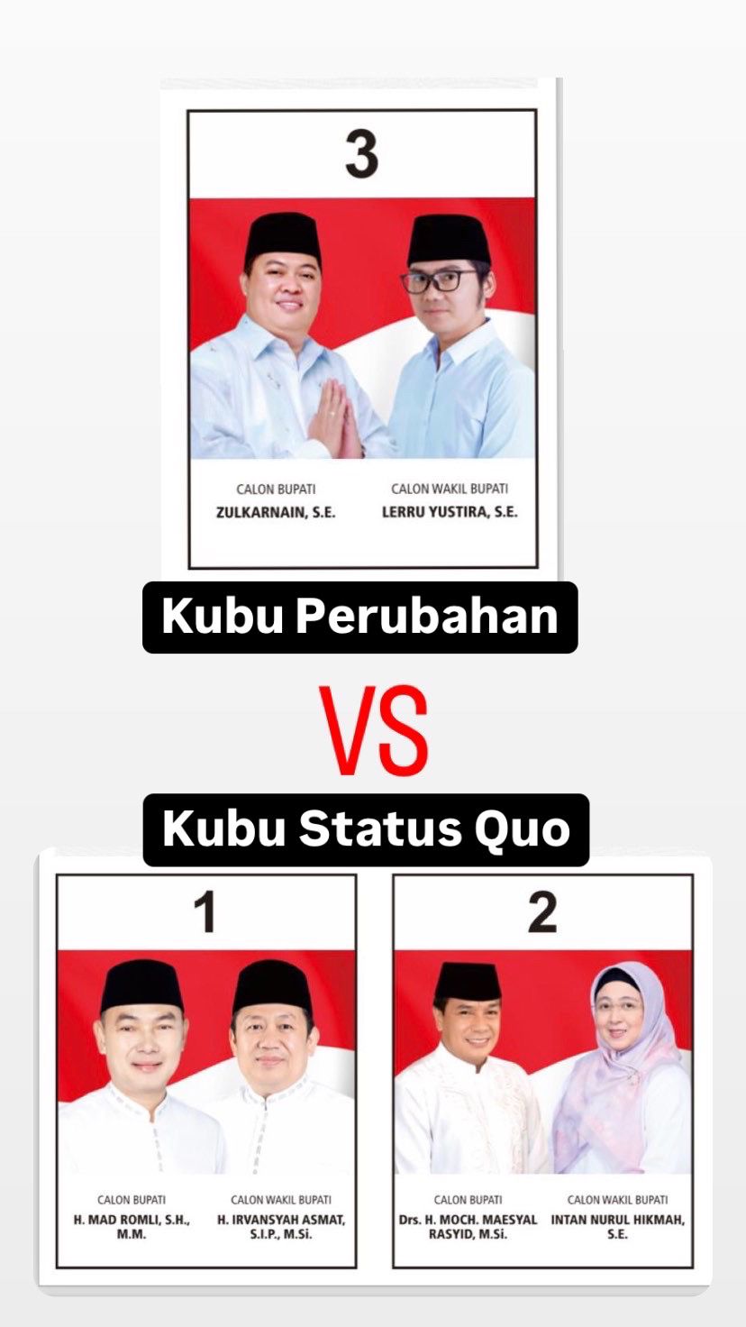 Tangsel – Pemilihan Bupati Tangerang yang akan datang menjadi ajang pertarungan sengit antara dua kekuatan politik utama: kubu perubahan yang diwakili oleh pasangan Zulkarnain-Lerru dan kubu status quo yang terpecah antara pasangan Rasyid Maesal-Intan dan Mad Romli-Irvansyah. Persaingan ini bukan hanya tentang siapa yang akan memimpin, tetapi juga tentang arah masa depan Kabupaten Tangerang.
